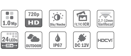 Cuenta con tecnología día/noche con filtro ICR y visión infrarroja de hasta 30 metros, garantizando vigilancia continua incluso en condiciones de oscuridad total. Su diseño con protección IP67 la hace resistente al agua y al polvo, perfecta para uso en exteriores.